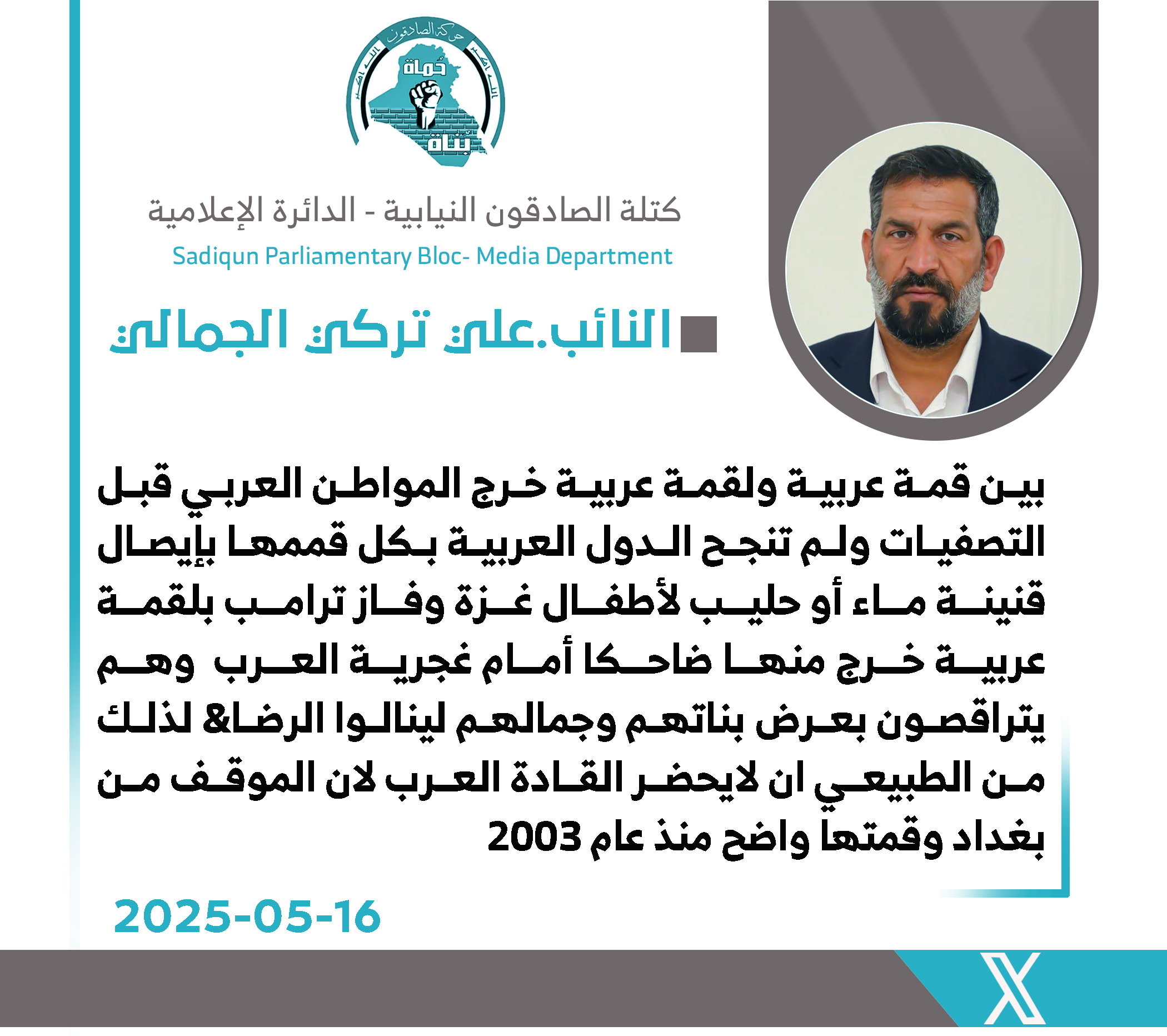 انتقد النائب عن كتلة الصادقون، علي تركي الجمالي، الجمعة، المواقف العربية الرسمية تجاه معاناة الشعب الفلسطيني في غزة، واصفاً القمم العربية بالعاجزة عن تحقيق أبسط أشكال الدعم الإنساني. وقال...