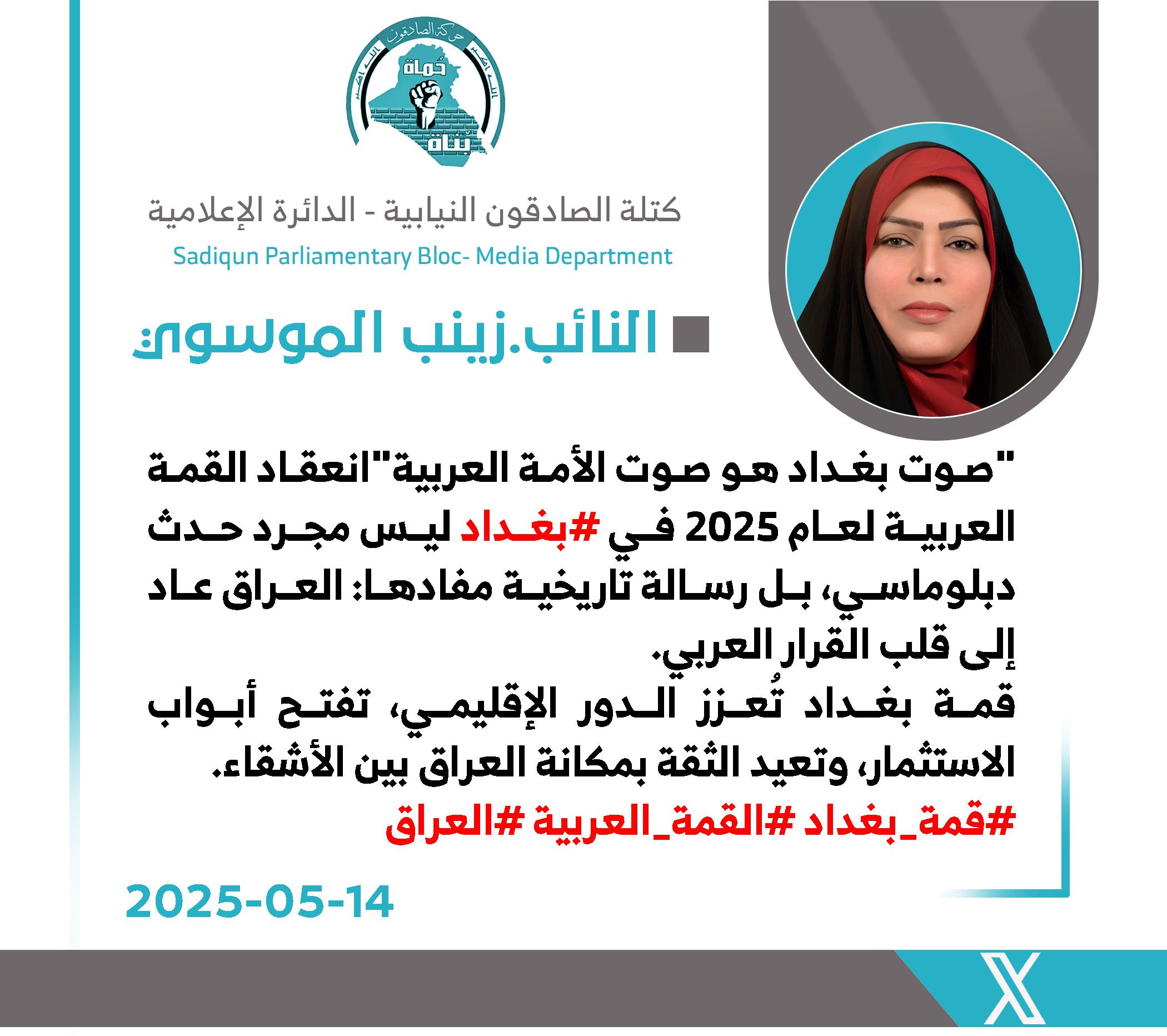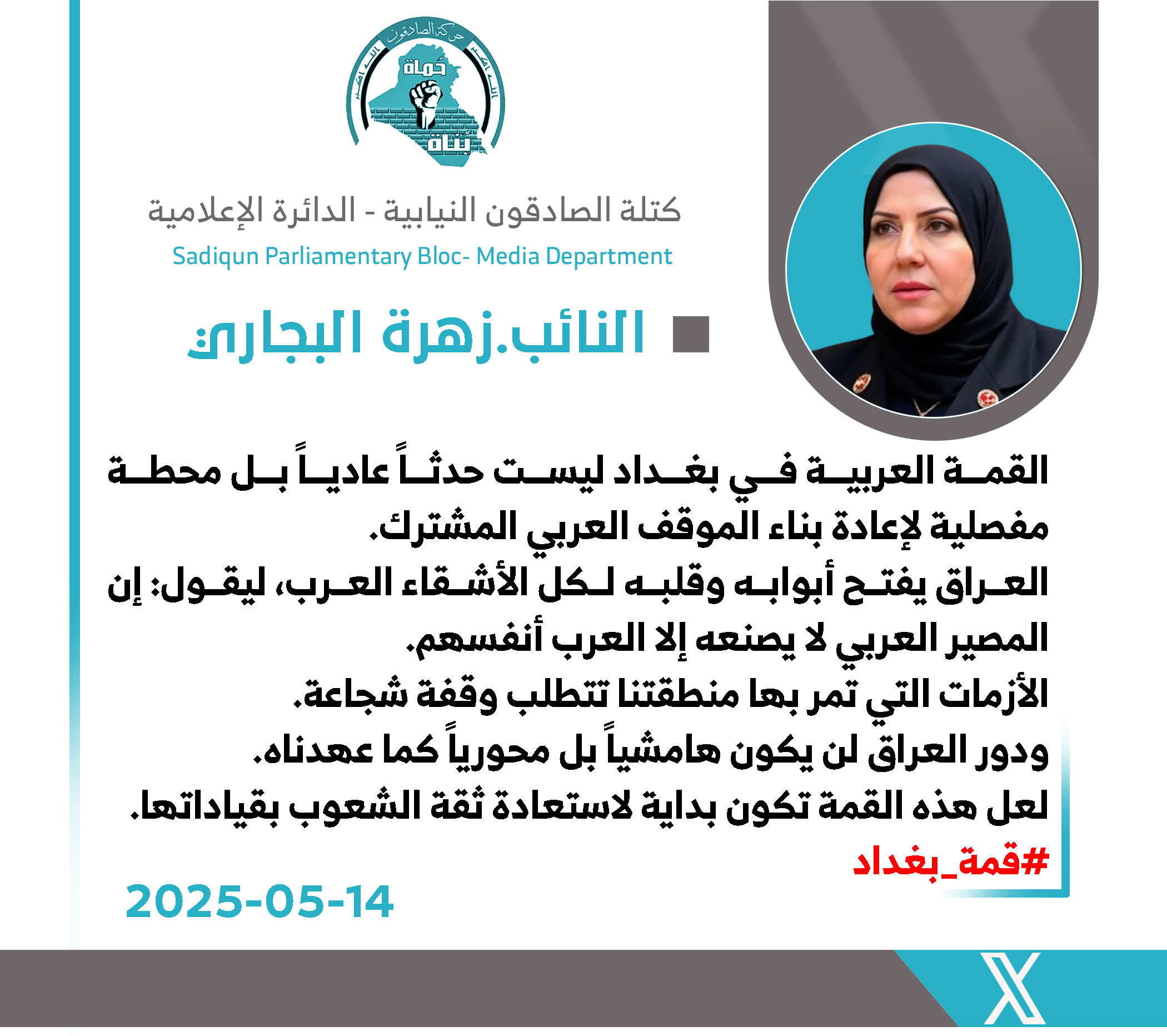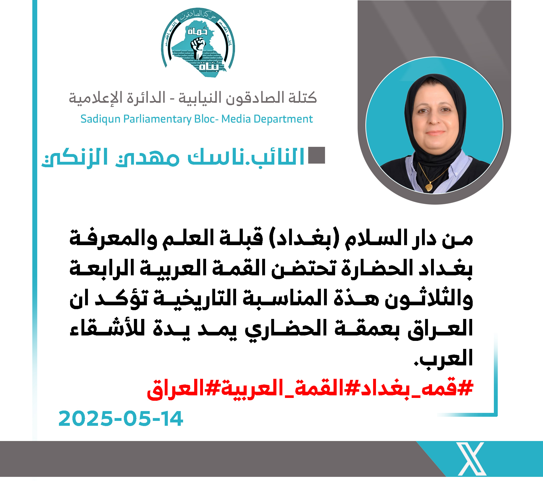 أكدت النائب عن كتلة الصادقون، ناسك الزنكي، الاربعاء، أن احتضان العاصمة بغداد للقمة العربية الرابعة والثلاثين يمثل مناسبة تاريخية تؤكد عمق العراق الحضاري وانفتاحه على محيطه العربي. وقالت...