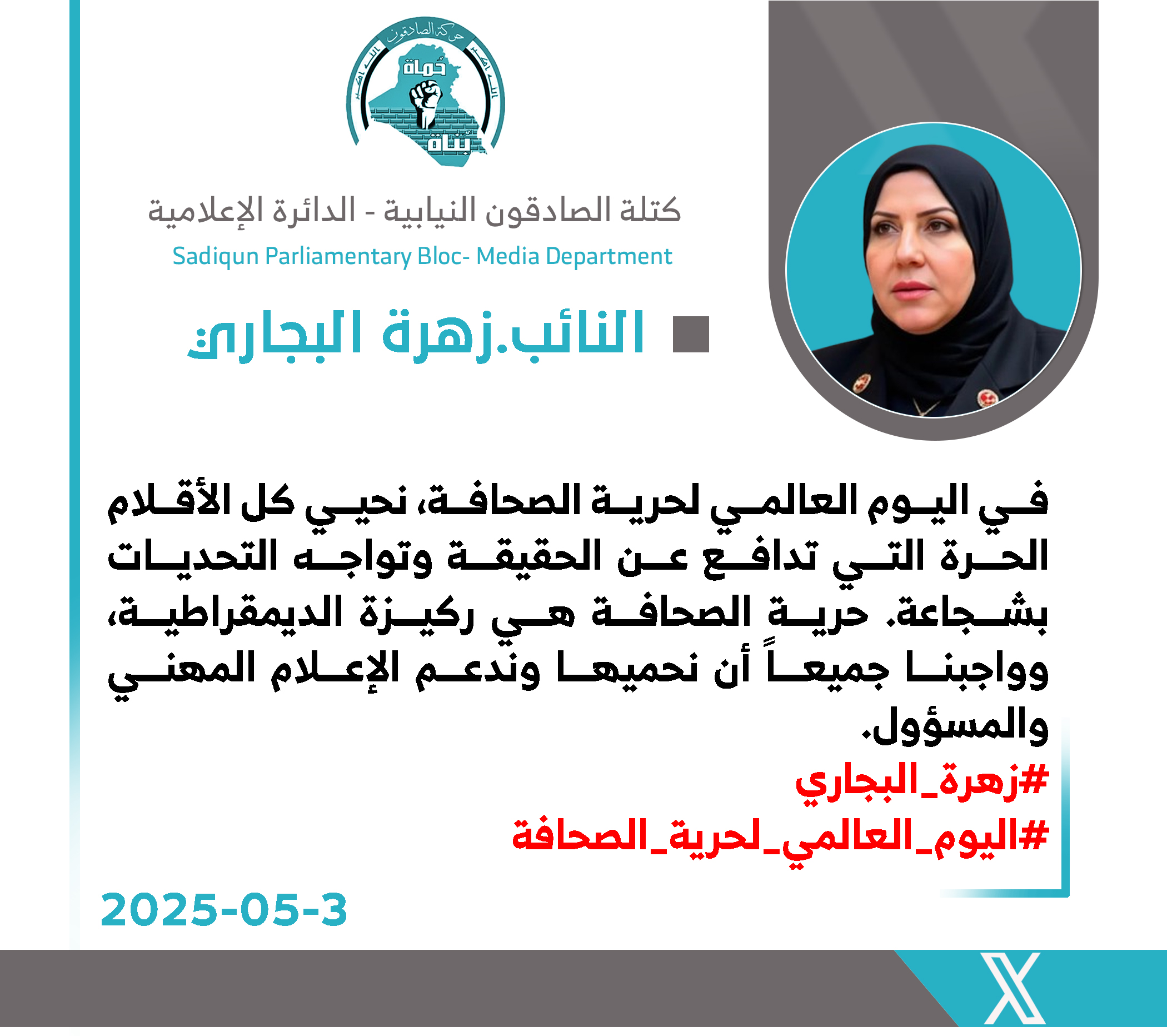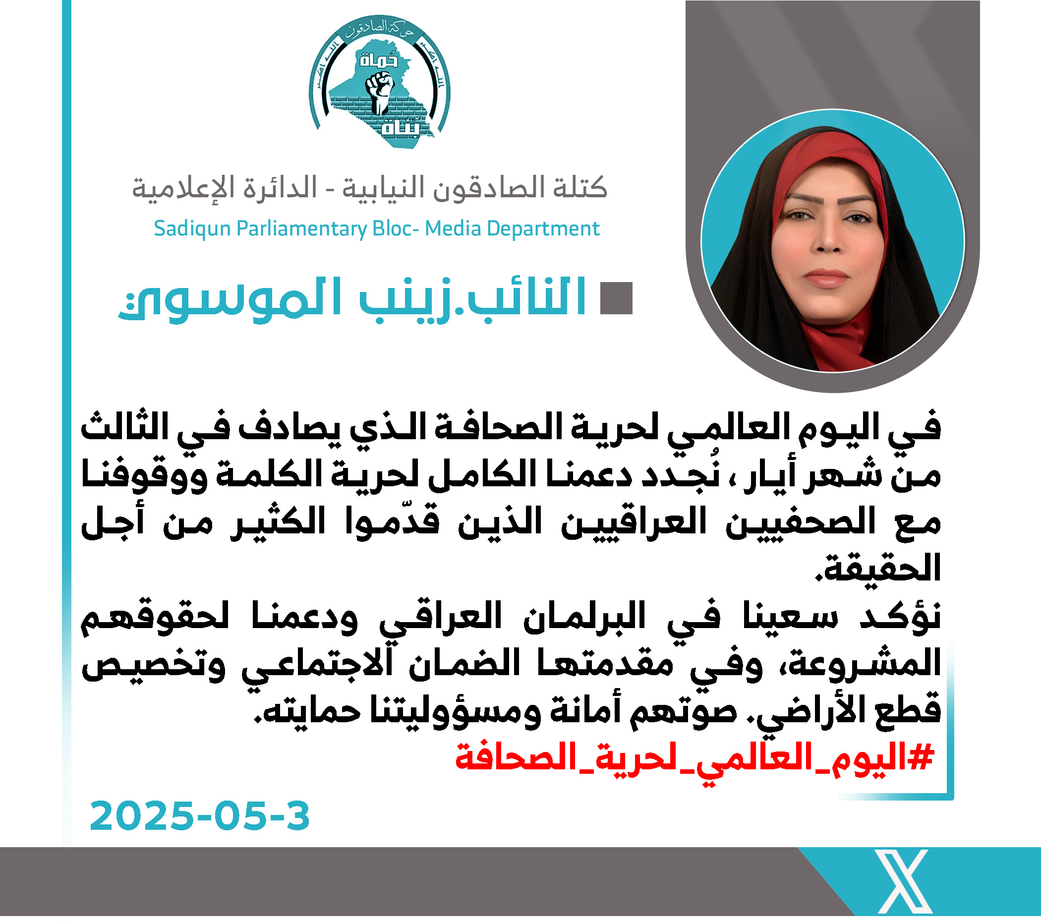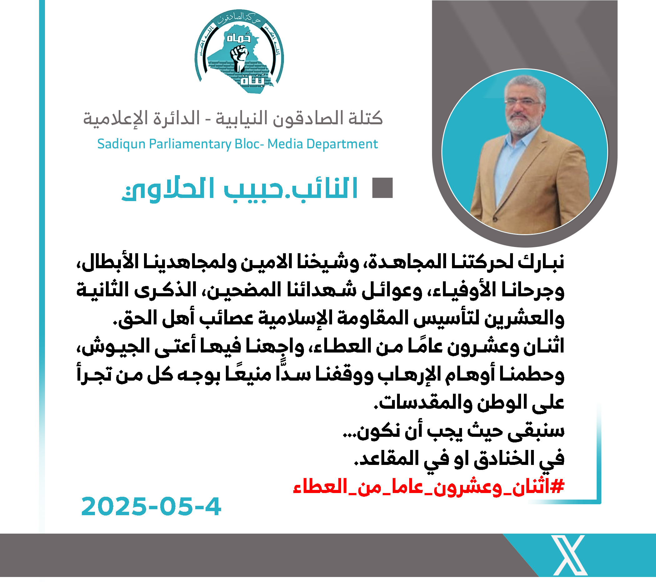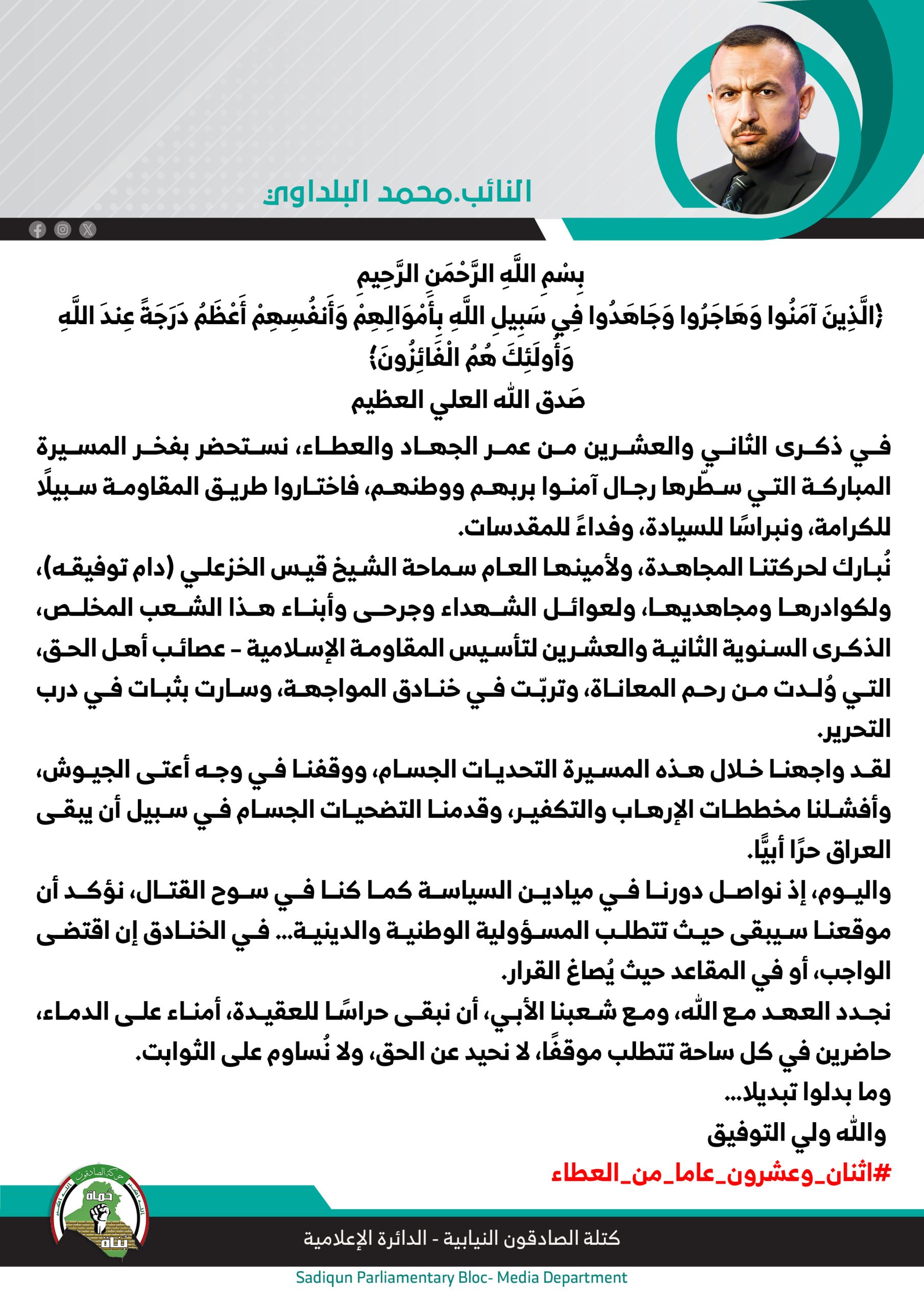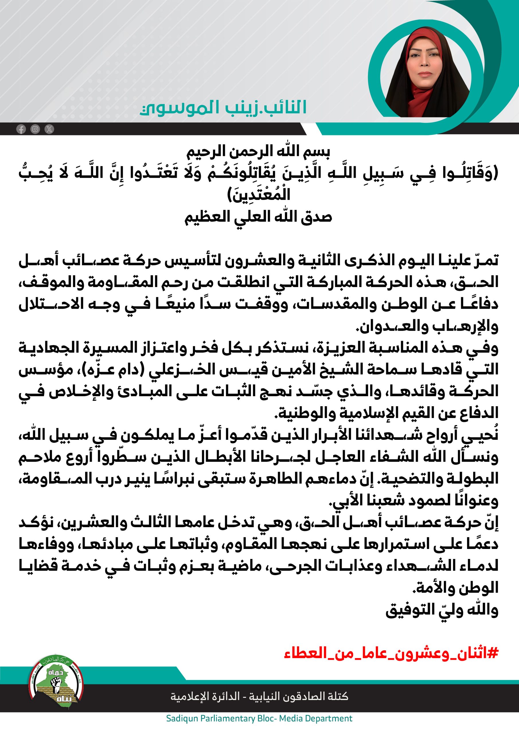 أكدت النائب عن كتلة الصادقون زينب الموسوي، اليوم الاحد، أن الذكرى الثانية والعشرين لتأسيس حركة عصائب أهل الحق تمثل محطة مهمة لاستذكار مسيرة الجهاد والمقاومة التي انطلقت دفاعًا عن الوطن...