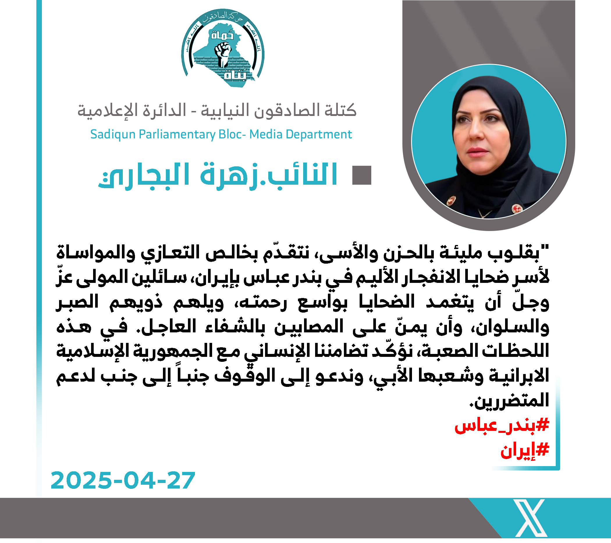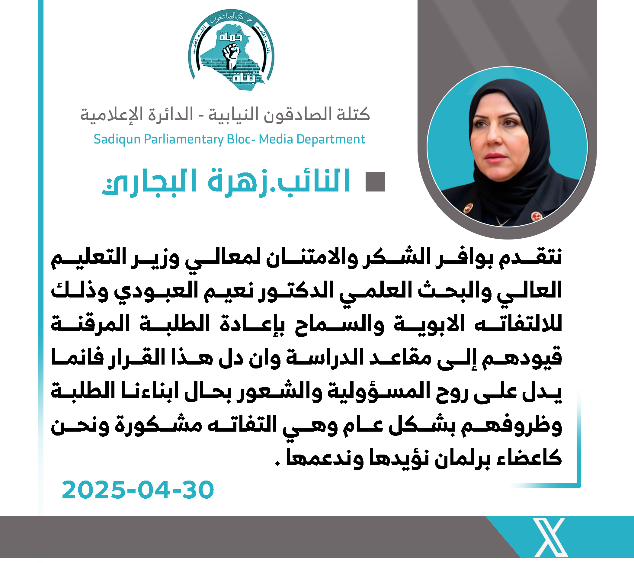 أكدت النائب عن كتلة الصادقون وعضو لجنة الصحة البرلمانية، زينب جمعة الموسوي، اليوم الأربعاء، على ضرورة التوسع في إنشاء مصحات علاج الإدمان وتوزيعها بشكل عادل في جميع المحافظات العراقية، وذلك...