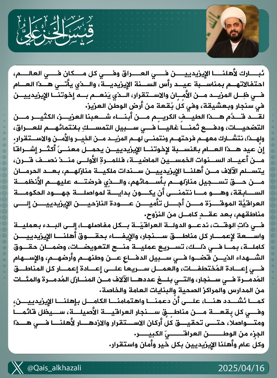 قدّم الأمين العام لحركة عصائب أهل الحق، سماحة الشيخ قيس الخزعلي، اليوم الأحد، أطيب التهاني والتبريكات إلى المسيحيين في العراق والعالم بمناسبة عيد القيامة المجيد، مشيدًا بعمق حضورهم الوطني...