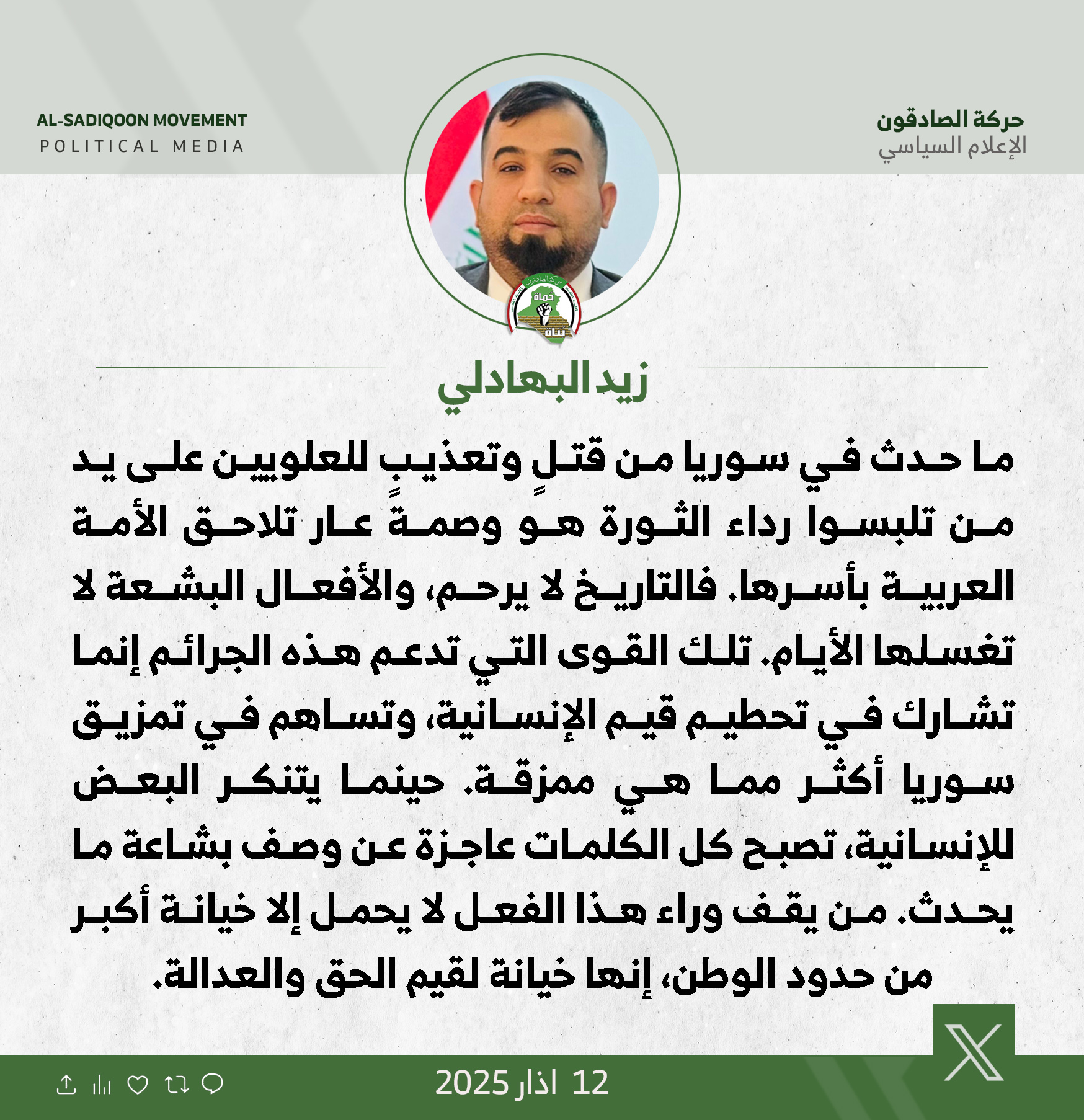 المزيدأكد عضو الهيئة العامة لحركة الصادقون، زيد البهادلي، أن ما جرى في سوريا من قتلٍ وتعذيبٍ للعلويين على يد من تلبسوا رداء الثورة يعد وصمة عار تلاحق الأمة العربية بأسرها. وقال البهادلي في تدوينة...