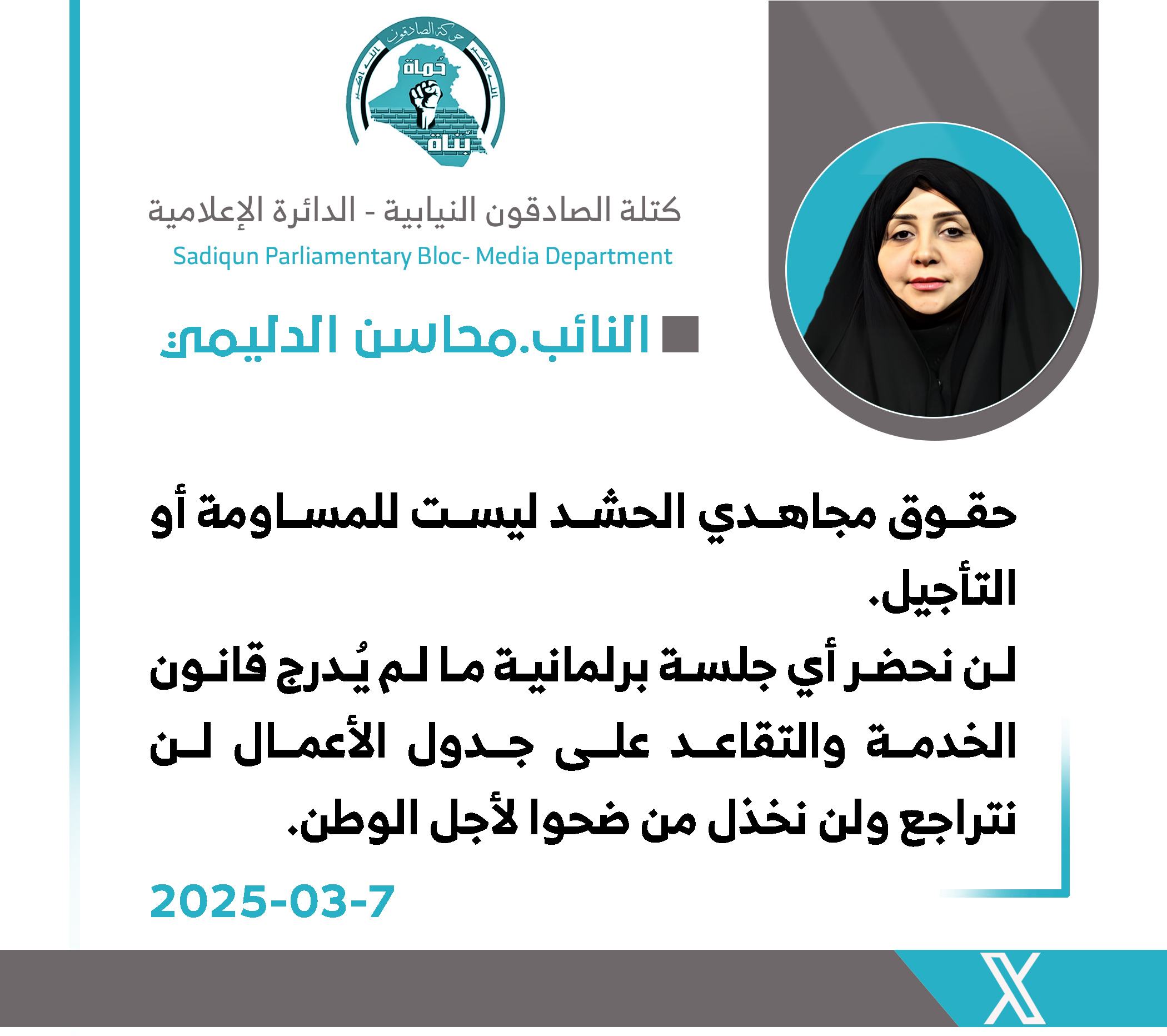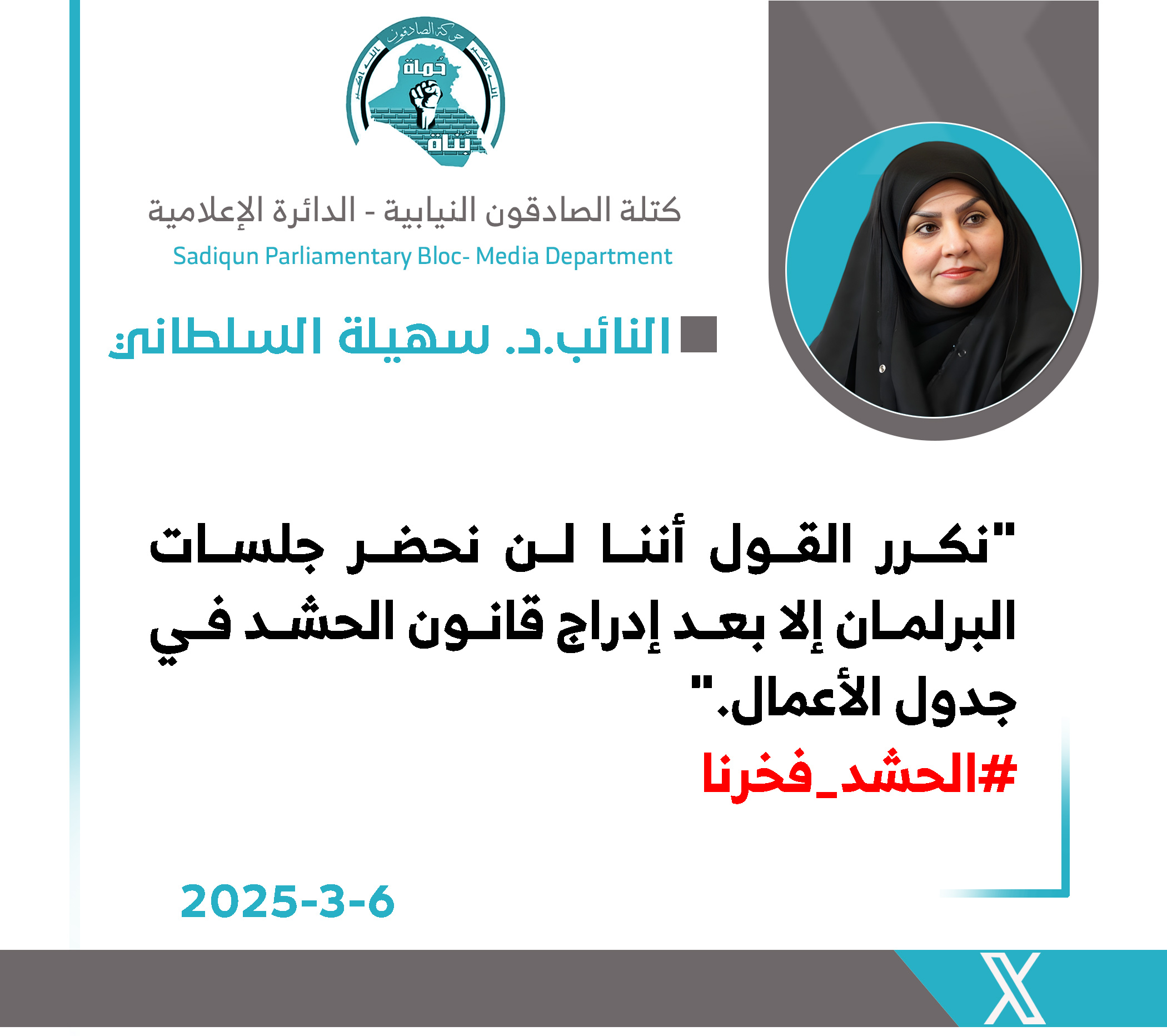 المزيدانتقدت رئيس لجنة النقل و الاتصالات النيابية عن كتلة الصادقون، زهرة البجاري، الخميس، ما وصفته بتعمد تعطيل الجلسات البرلمانية، معتبرة أن هذا النهج يؤثر سلبًا على العملية التشريعية وسير العمل...