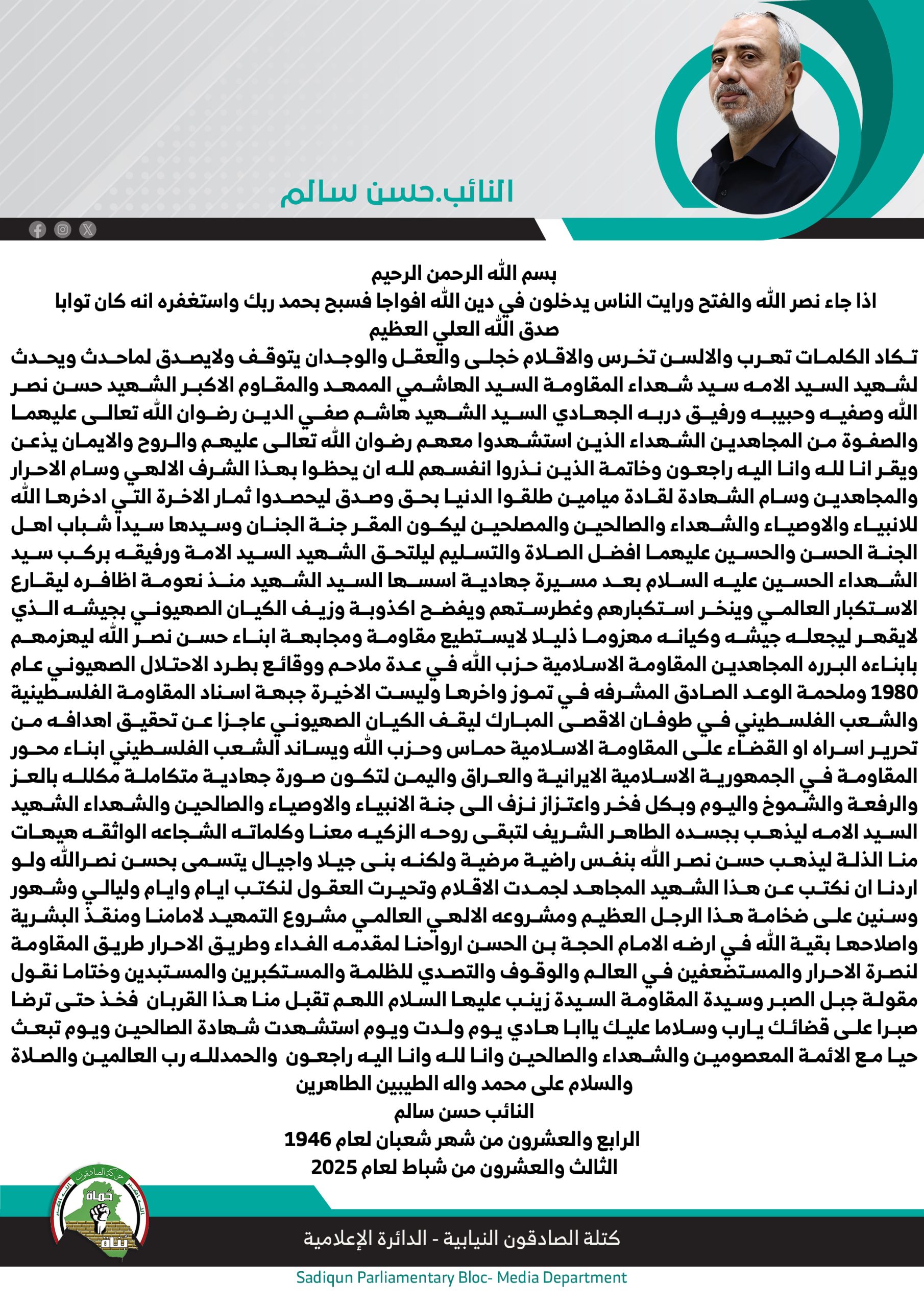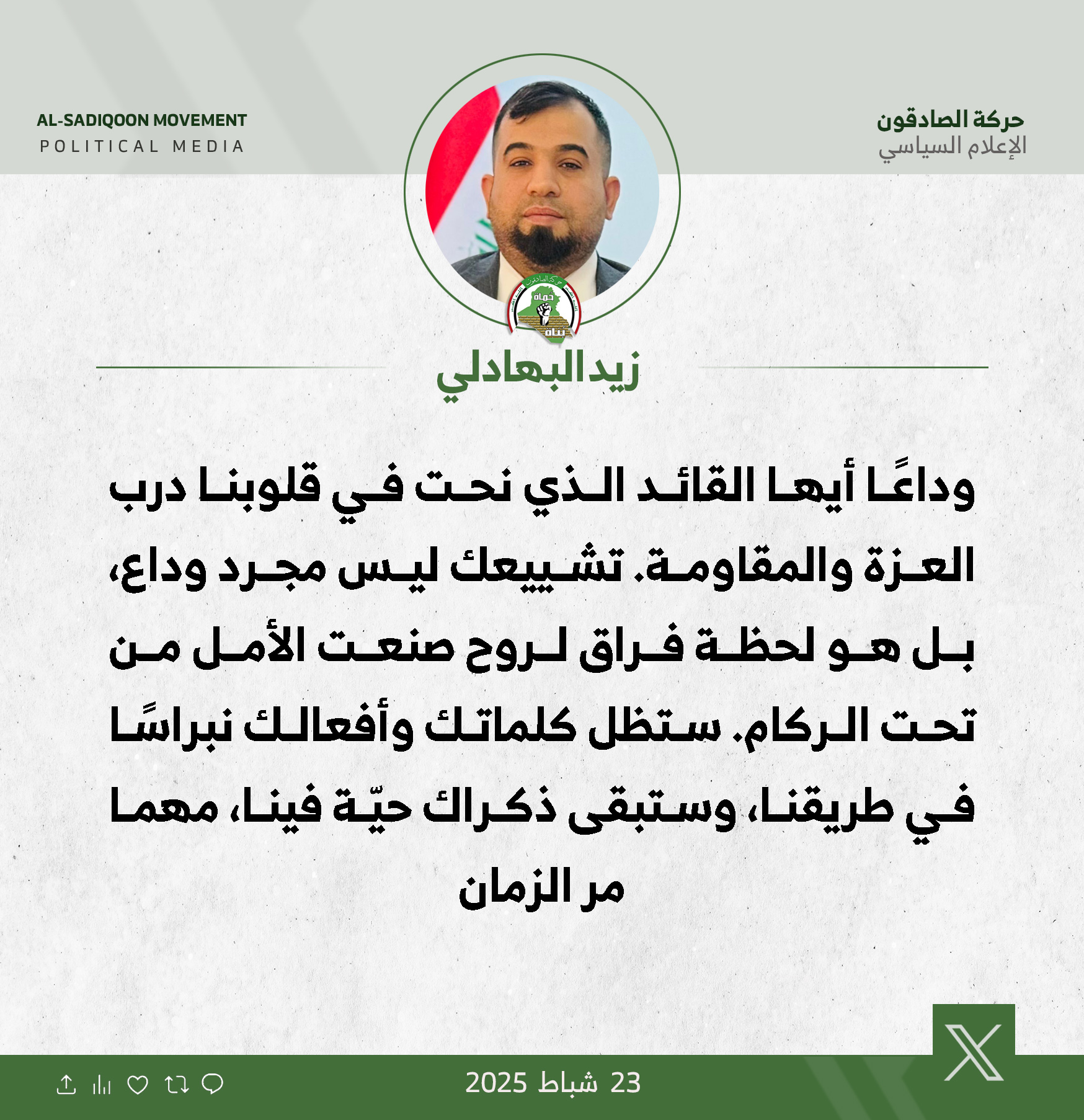 شارك سماحة السيد محمد الطباطبائي، نائب الأمين العام لحركة عصائب أهل الحق، اليوم الإثنين، في مراسم تشييع الشهيد الهاشمي السيد هاشم صفي الدين، رئيس المجلس التنفيذي في حزب الله لبنان، إلى مثواه...