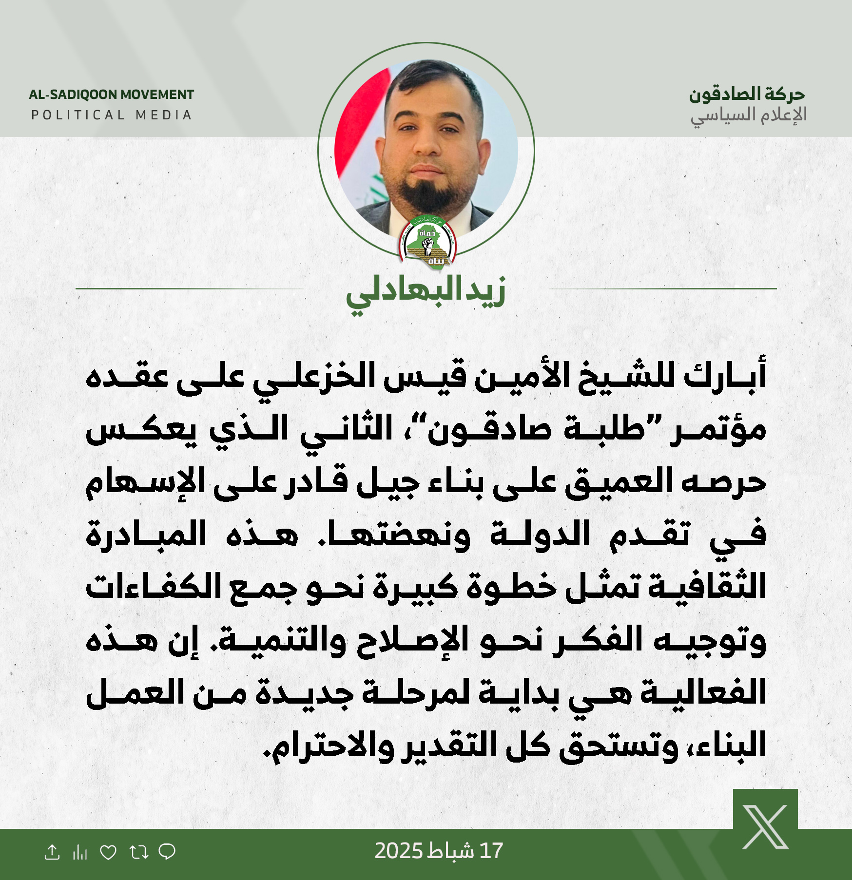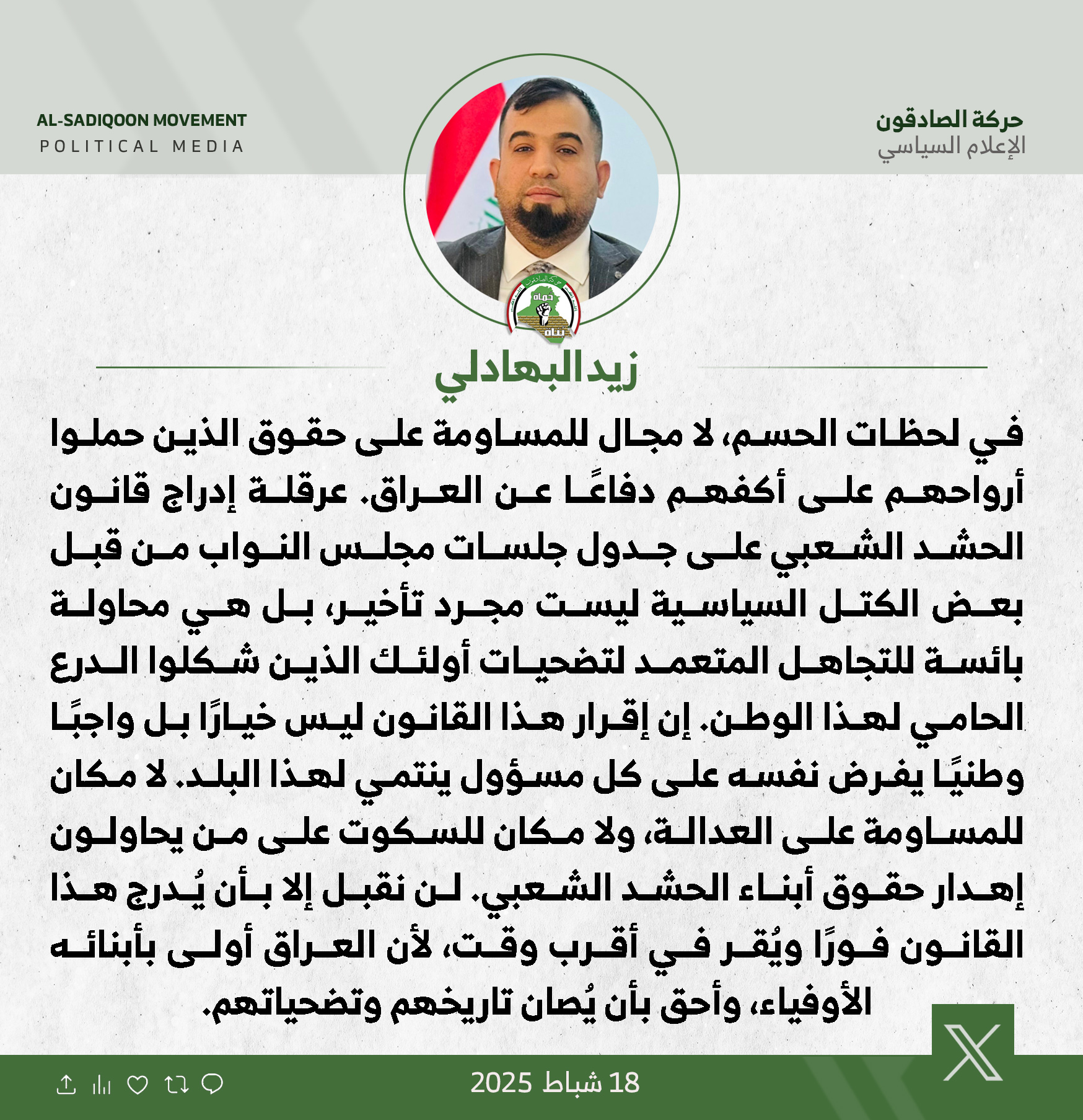 عد عضو الهيئة العامة لحركة الصادقون، زيد البهادلي، الثلاثاء، التأخير المتعمد في إدراج قانون الحشد الشعبي على جدول أعمال مجلس النواب محاولة بائسة لتجاهل تضحيات الابطال الذين حملوا أرواحهم...