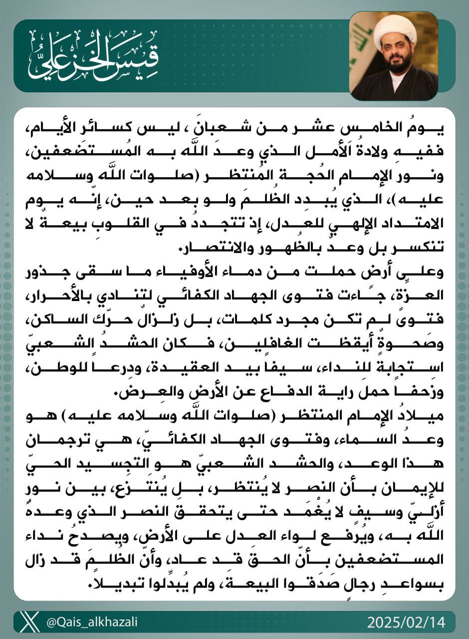 المزيدأكد الأمين العام لحركة عصائب أهل الحق ، سماحة الشيخ قيس الخزعلي، اليوم الجمعة، أن يوم الخامس عشر من شعبان ليس كسائر الأيام، فهو يوم ولادة الأمل الذي وعد الله به المستضعفين، بظهور الإمام الحجة...