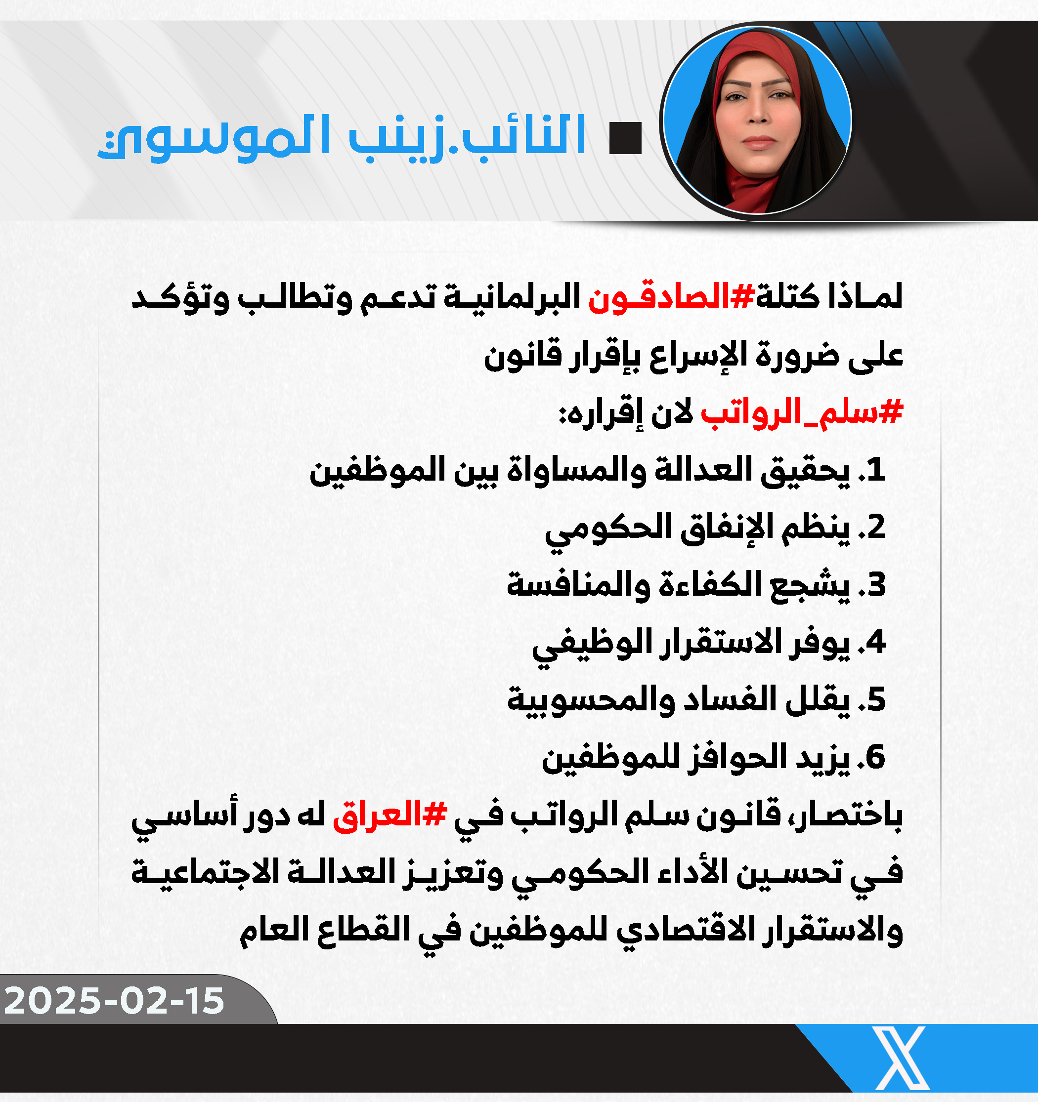 أكدت النائب عن كتلة الصادقون البرلمانية، زينب الموسوي، على ضرورة الإسراع في إقرار قانون سلم الرواتب، لما له من أهمية كبيرة في تحقيق العدالة الاجتماعية وتعزيز الاستقرار الاقتصادي في...
