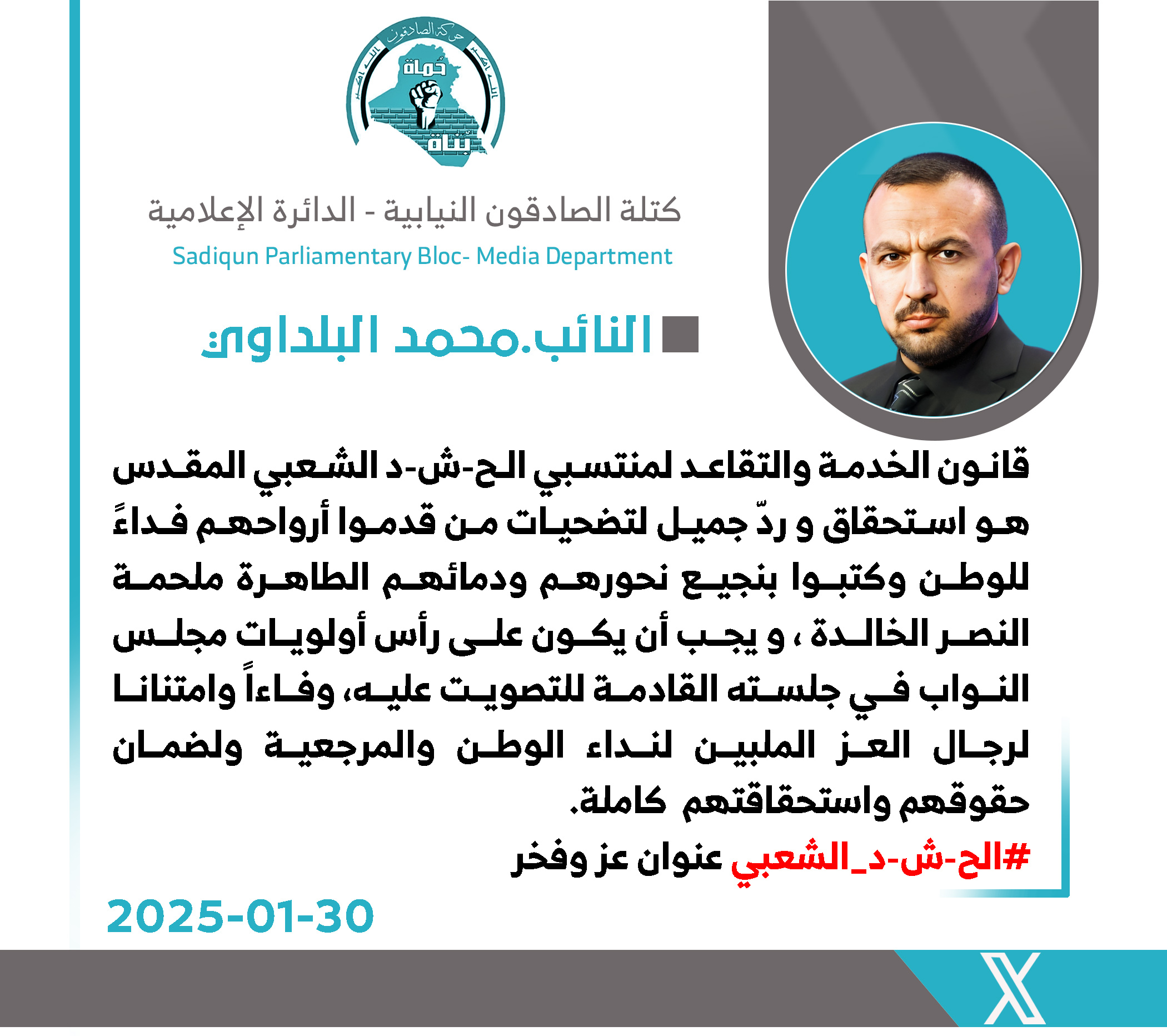 تثميناً لتضحياتهم .. البلداوي يدعو البرلمان الى الإسراع بحسم قانون الخدمة والتقاعد لمنتسبي الحشد الشعبي