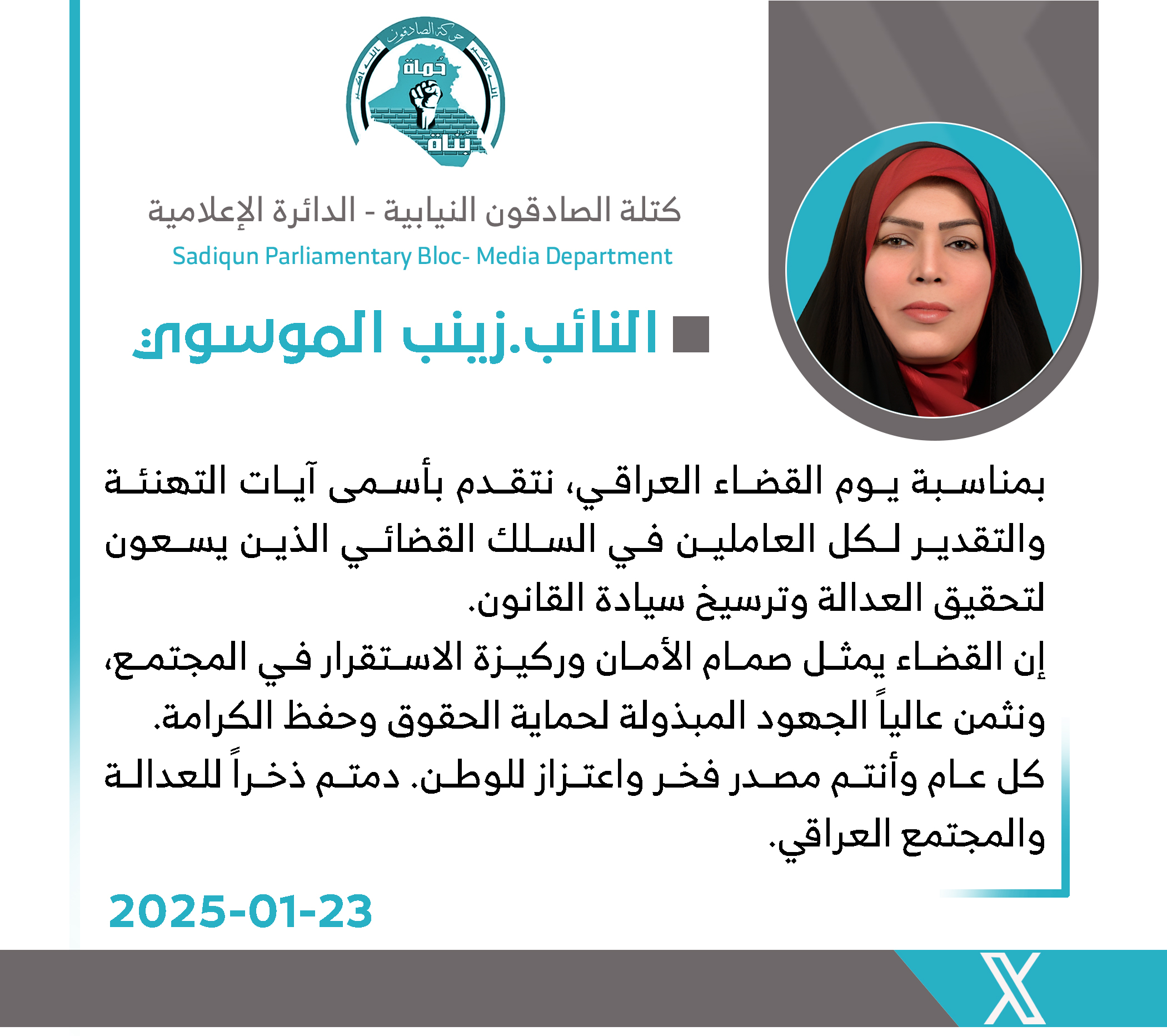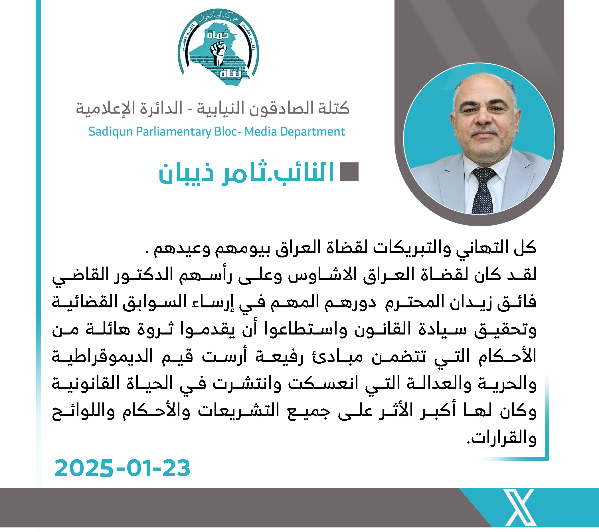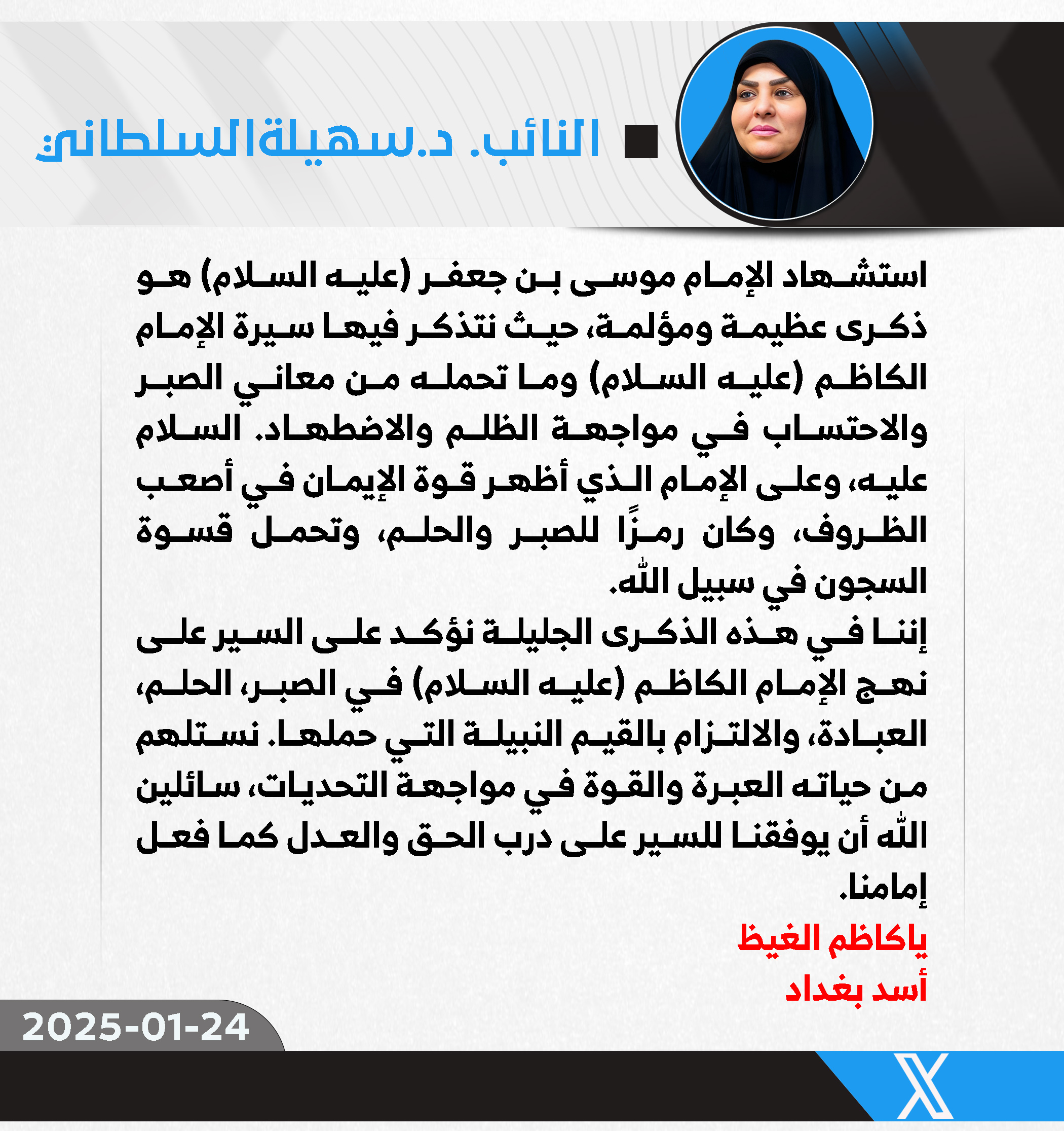 قدّم المتحدث باسم كتلة الصادقون، النائب محمد البلداوي، اليوم السبت، أحر التعازي وأصدق المواساة إلى الإمام المهدي (عليه السلام)، والمراجع العظام، والأمة الإسلامية جمعاء بمناسبة ذكرى استشهاد...