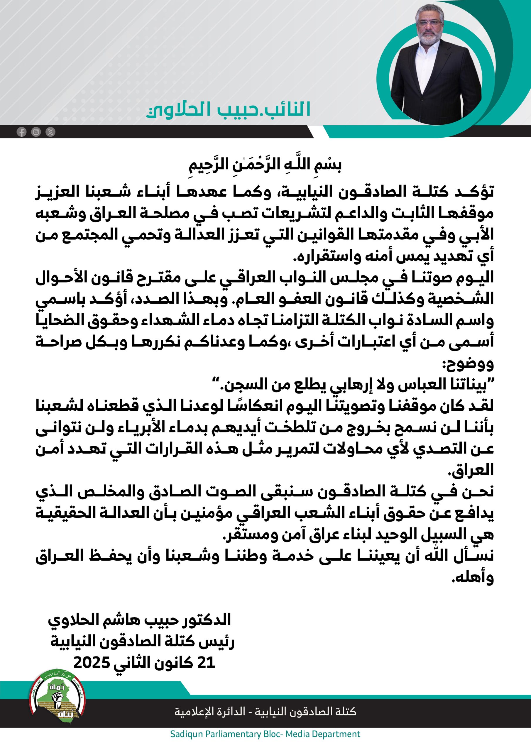 المزيدأكد رئيس كتلة الصادقون النيابية، الدكتور حبيب الحلاوي، اليوم الثلاثاء، التزام الكتلة الدائم بدعم التشريعات التي تصب في مصلحة العراق وشعبه، وتعزز العدالة وتحمي المجتمع من أي تهديد يمس أمنه...