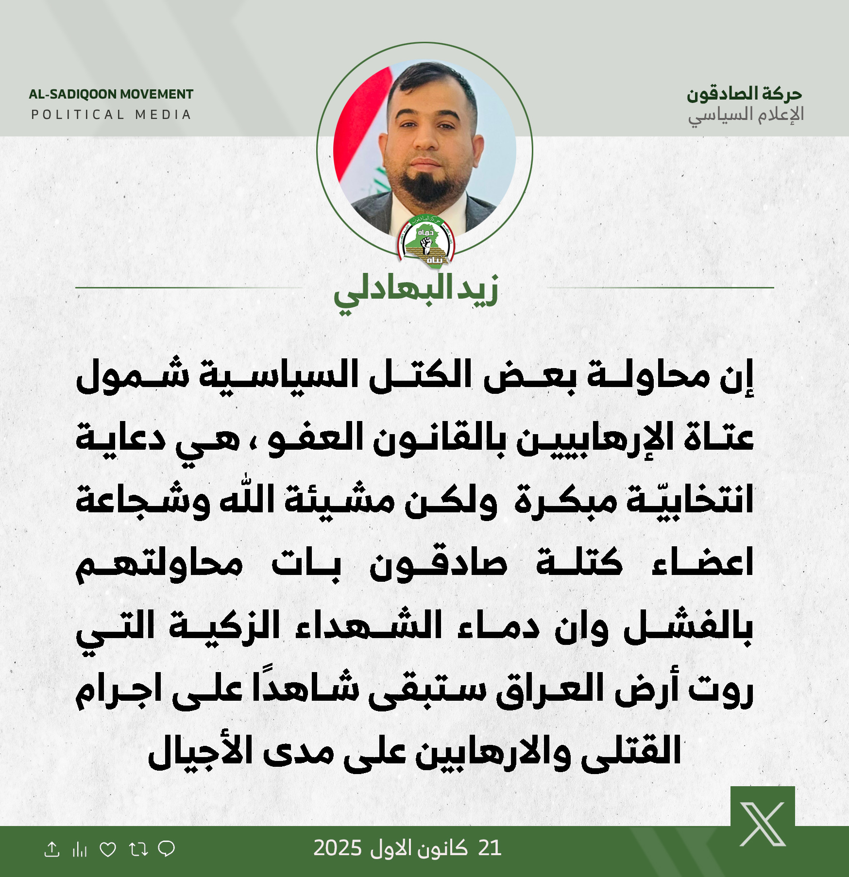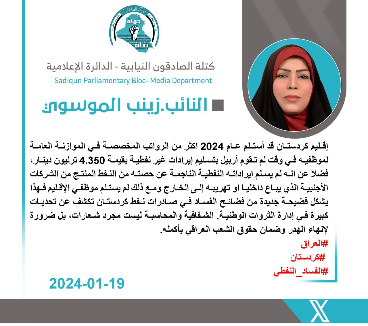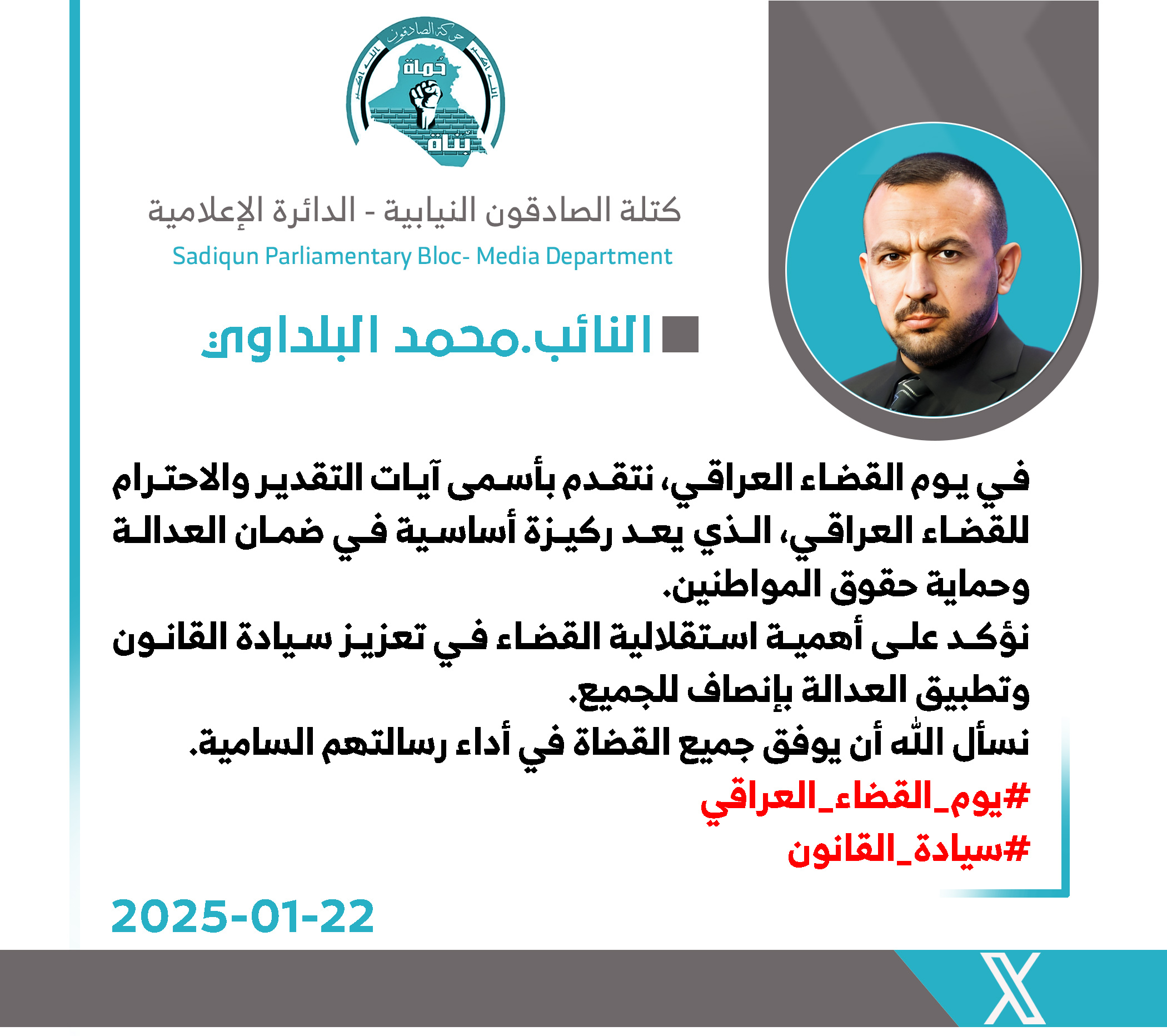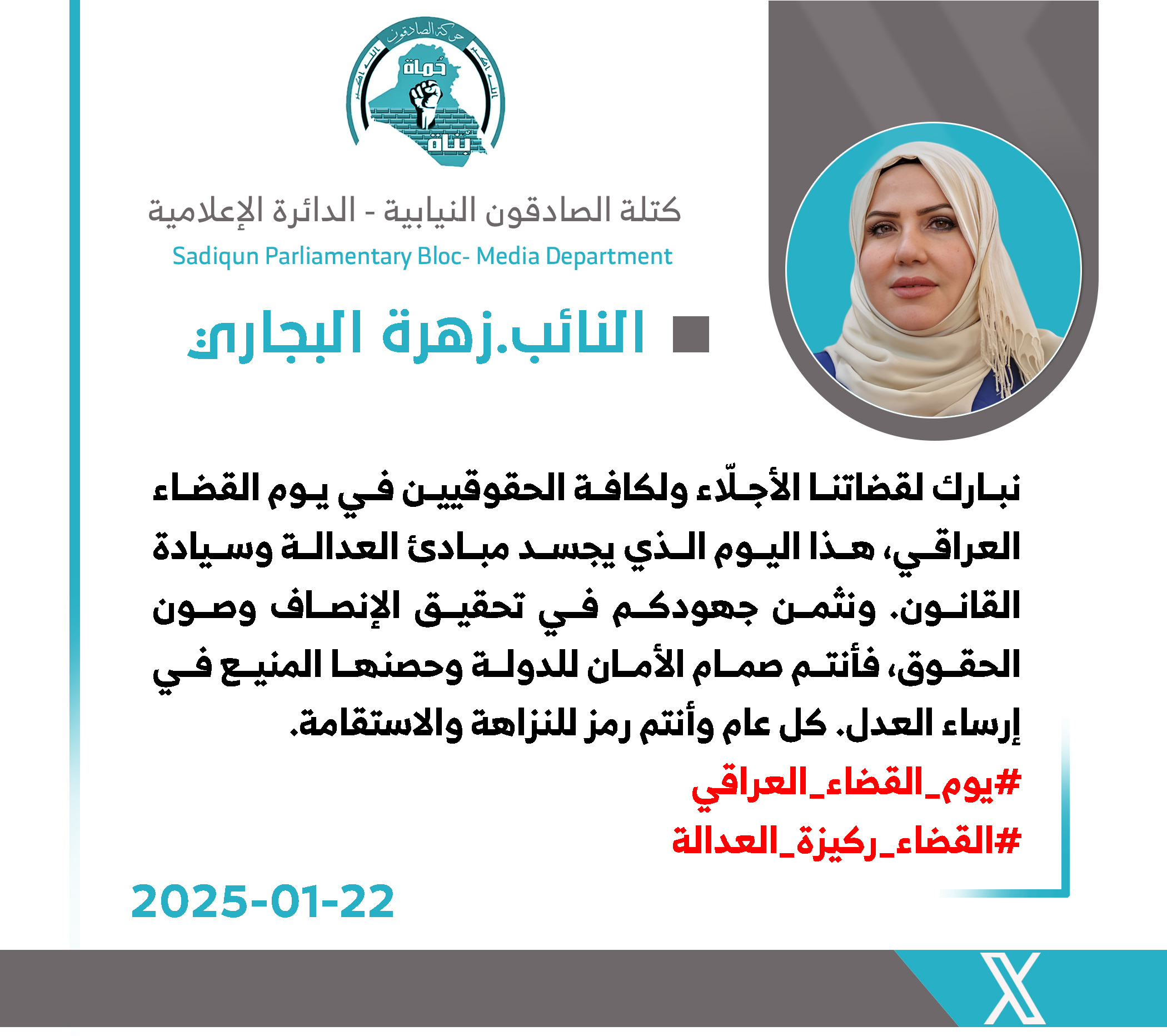تقدمت رئيس لجنة النقل والاتصالات النيابية عن كتلة الصادقون، زهرة البجاري،اليوم الأربعاء، بأسمى آيات التهاني والتبريكات إلى قضاة العراق الأجلاء وكافة الحقوقيين بمناسبة يوم القضاء العراقي،...