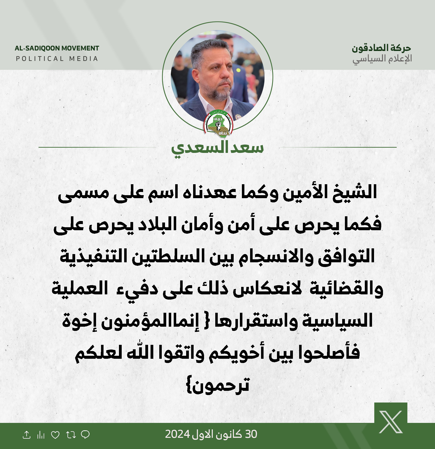 أكد المتحدث باسم كتلة الصادقون، النائب محمد البلداوي، اليوم الجمعة، أن ذكرى استشهاد قادة النصر تمثل محطة لاستلهام معاني التضحية والفداء من أجل الوطن والأمة. وقال البلداوي في تدوينة على منصة...