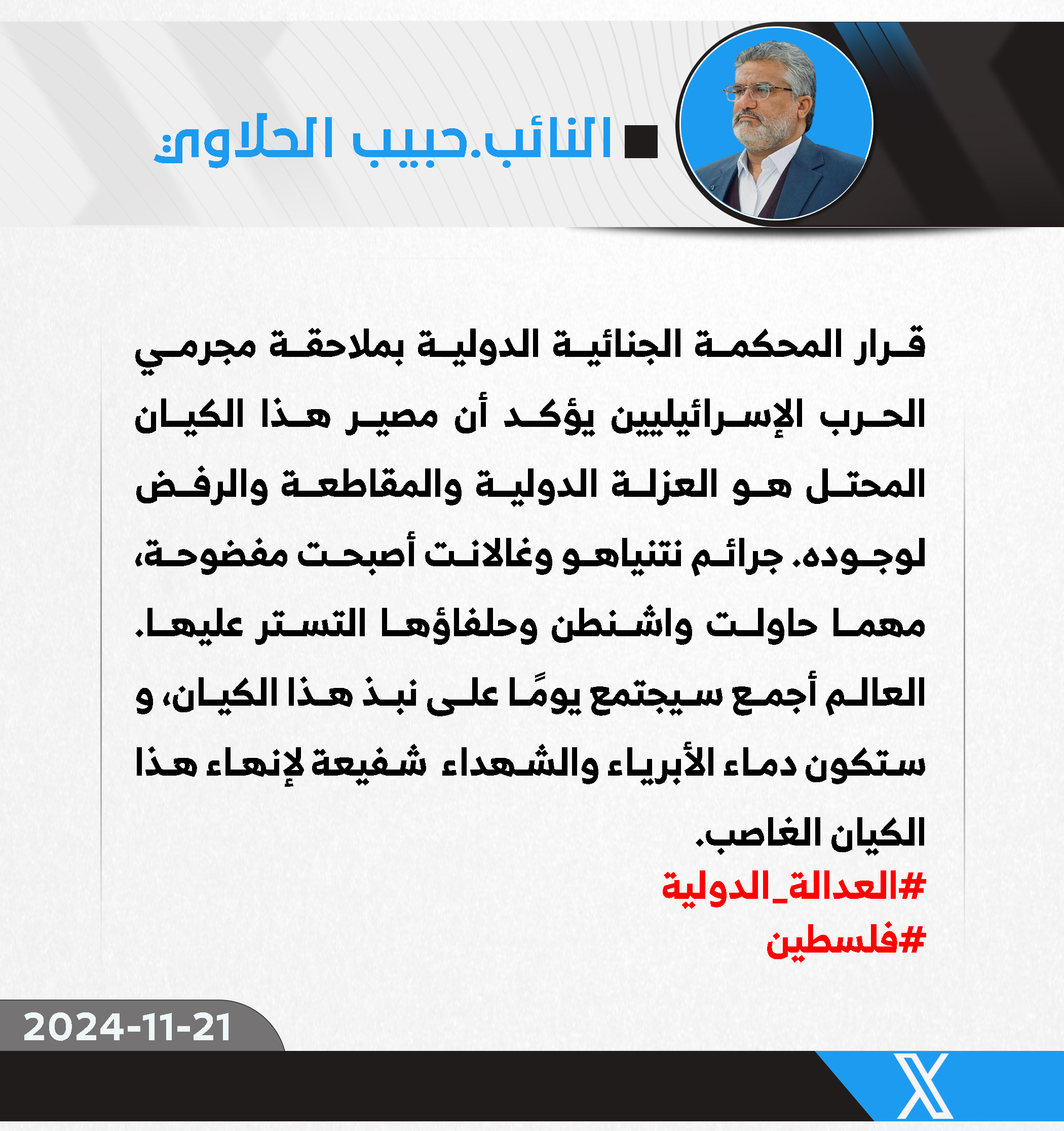 المزيدأكد رئيس كتلة الصادقون النيابية، النائب حبيب الحلاوي،الخميس، أن قرار المحكمة الجنائية الدولية بملاحقة مجرمي الحرب الإسرائيليين يعكس تحولًا مهمًا في الموقف الدولي تجاه الجرائم المستمرة...