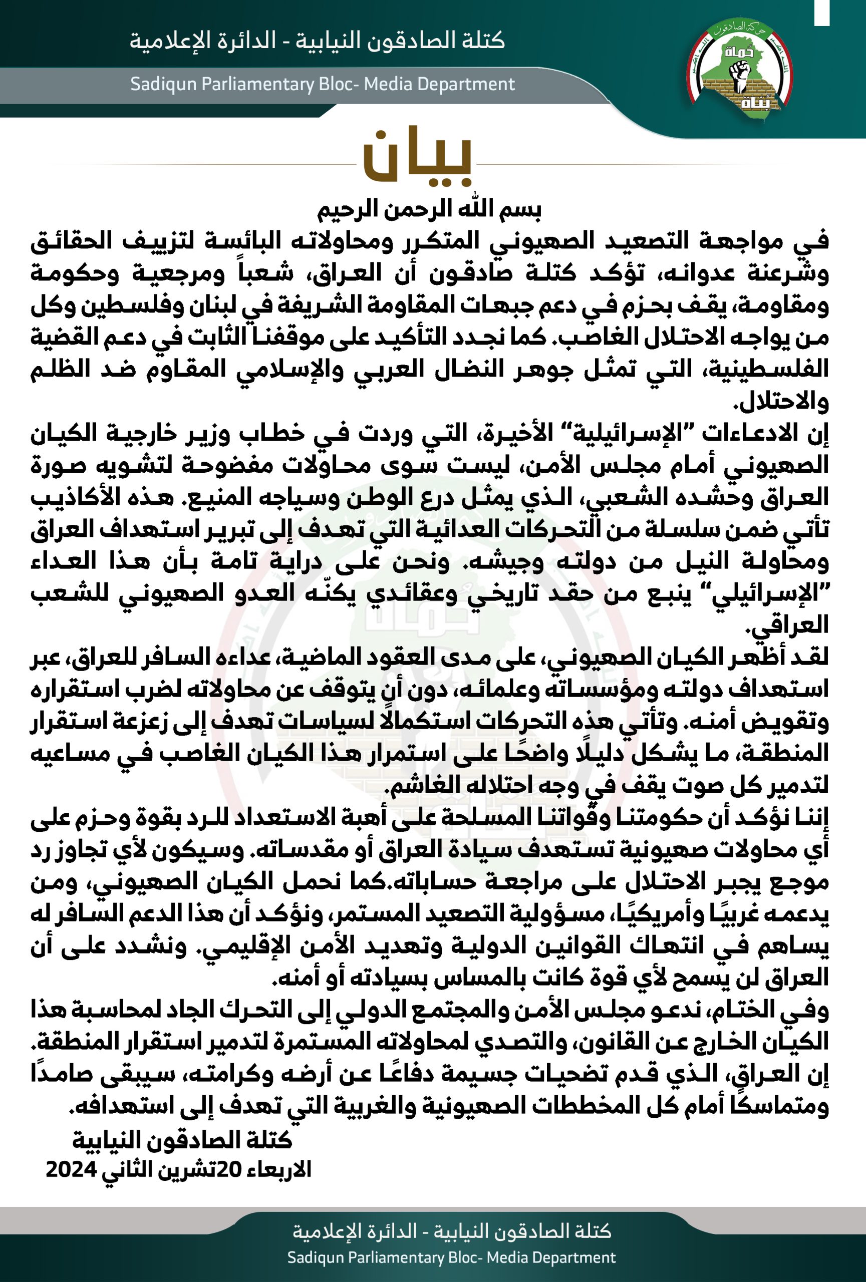 المزيدأكدت كتلة صادقون النيابية ، اليوم الأربعاء، موقف العراق الثابت في مواجهة التصعيد الصهيوني المتكرر، مشددة على دعمها لجبهات المقاومة في فلسطين ولبنان، ومنددة بمحاولات الاحتلال الإسرائيلي...