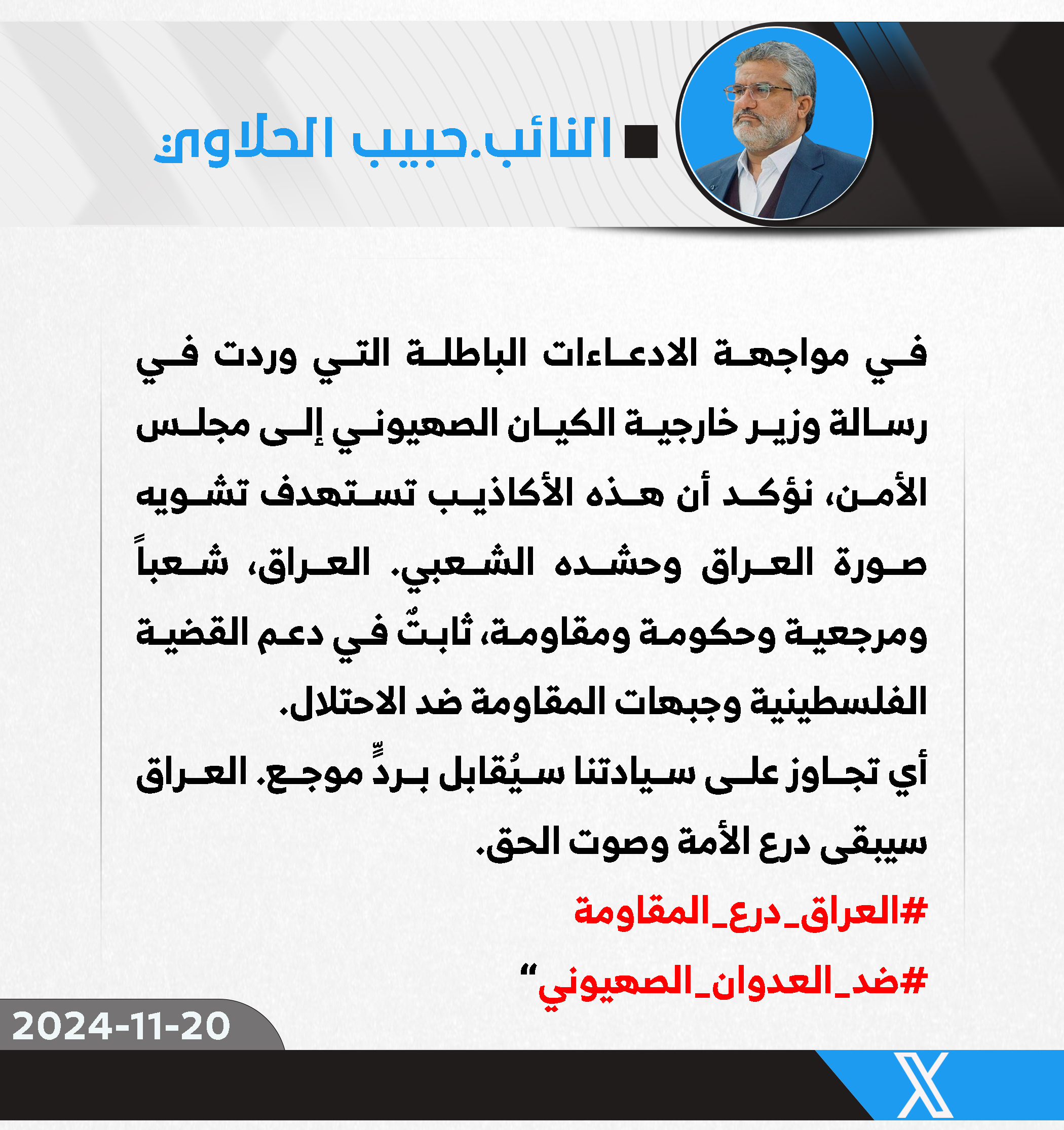 المزيدأكد رئيس كتلة الصادقون النيابية، النائب حبيب الحلاوي، الأربعاء، أن العراق بجميع مكوناته، من شعب ومرجعية وحكومة ومقاومة، ثابت في دعمه للقضية الفلسطينية وجبهات المقاومة ضد الاحتلال، وذلك في...