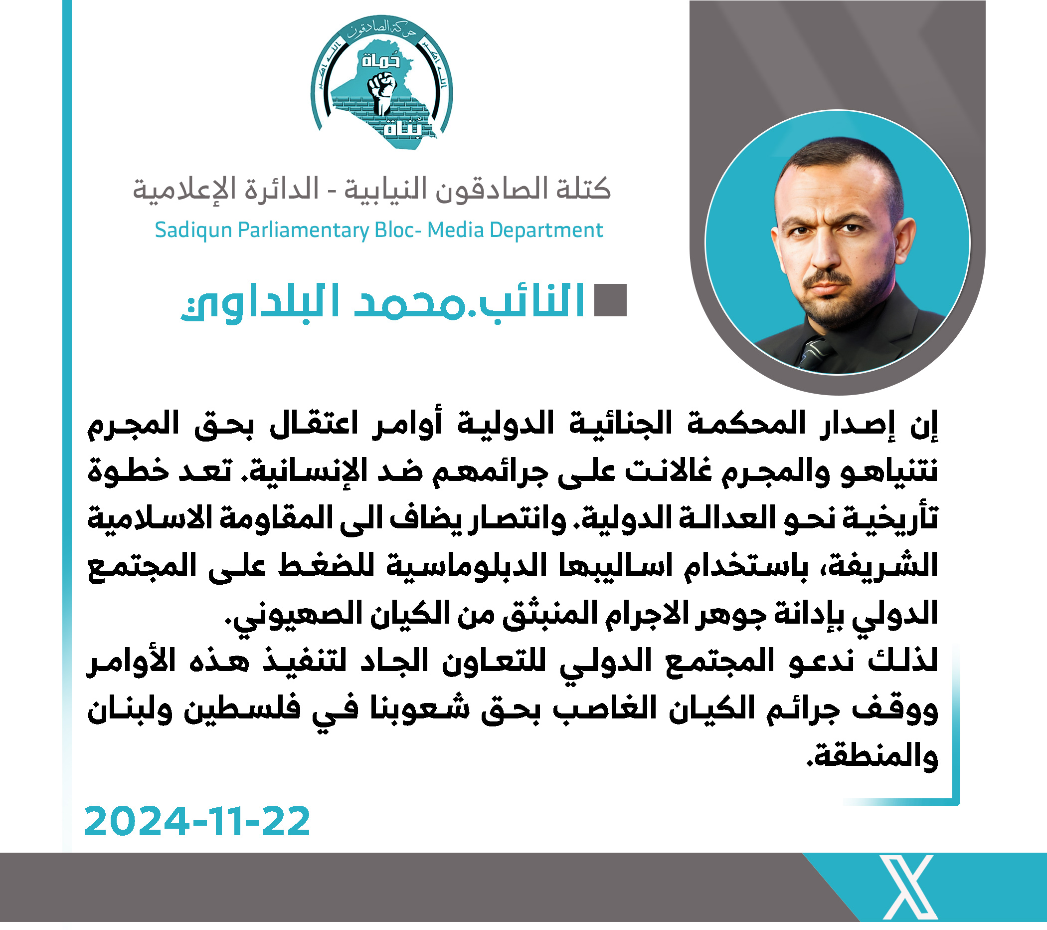 أشاد الأمين العام لحركة عصائب أهل الحق، سماحة الشيخ قيس الخزعلي،اليوم الجمعة، بالجهود الدولية التي أسفرت عن إصدار المحكمة الجنائية الدولية أوامر اعتقال بحق رئيس حكومة الاحتلال الصهيوني...